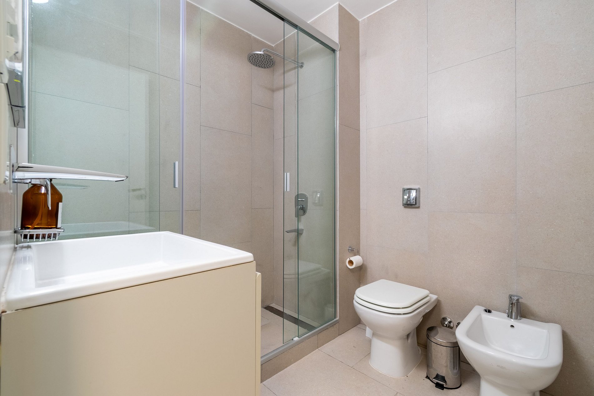 Uno de los dormitorios tiene una cama king-size con baño en suite, el segundo dormitorio tiene dos camas individuales y el tercero una cama individual. Estos últimos dos dormitorios cuentan con un baño con ducha. Además, hay un toilette.