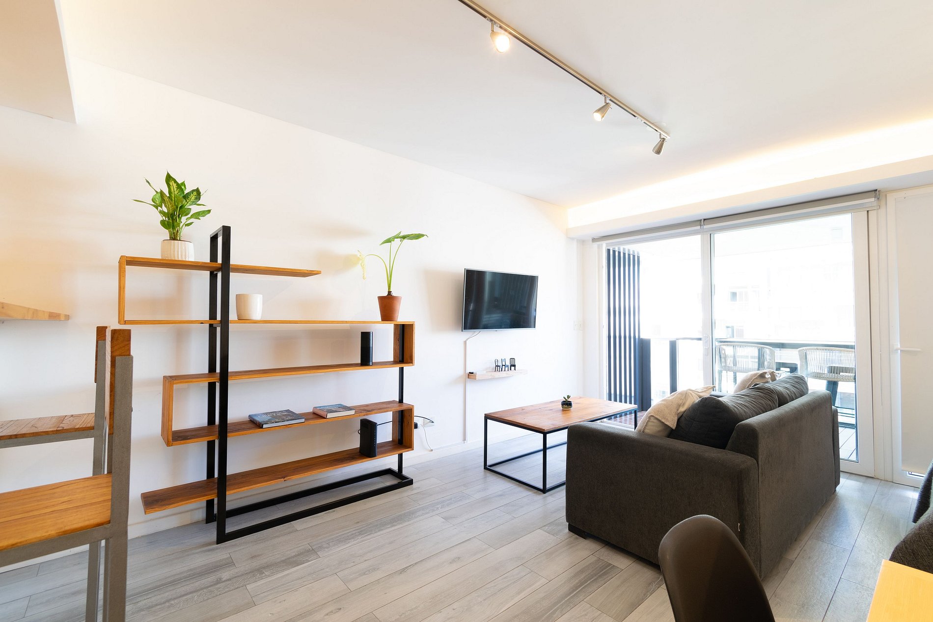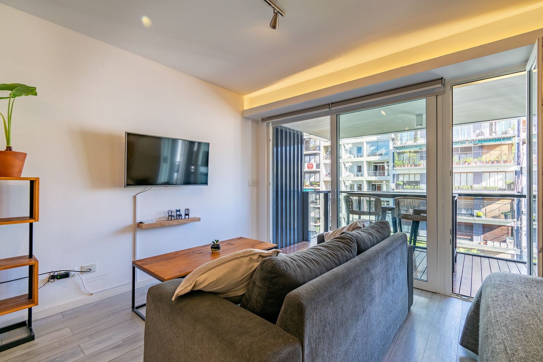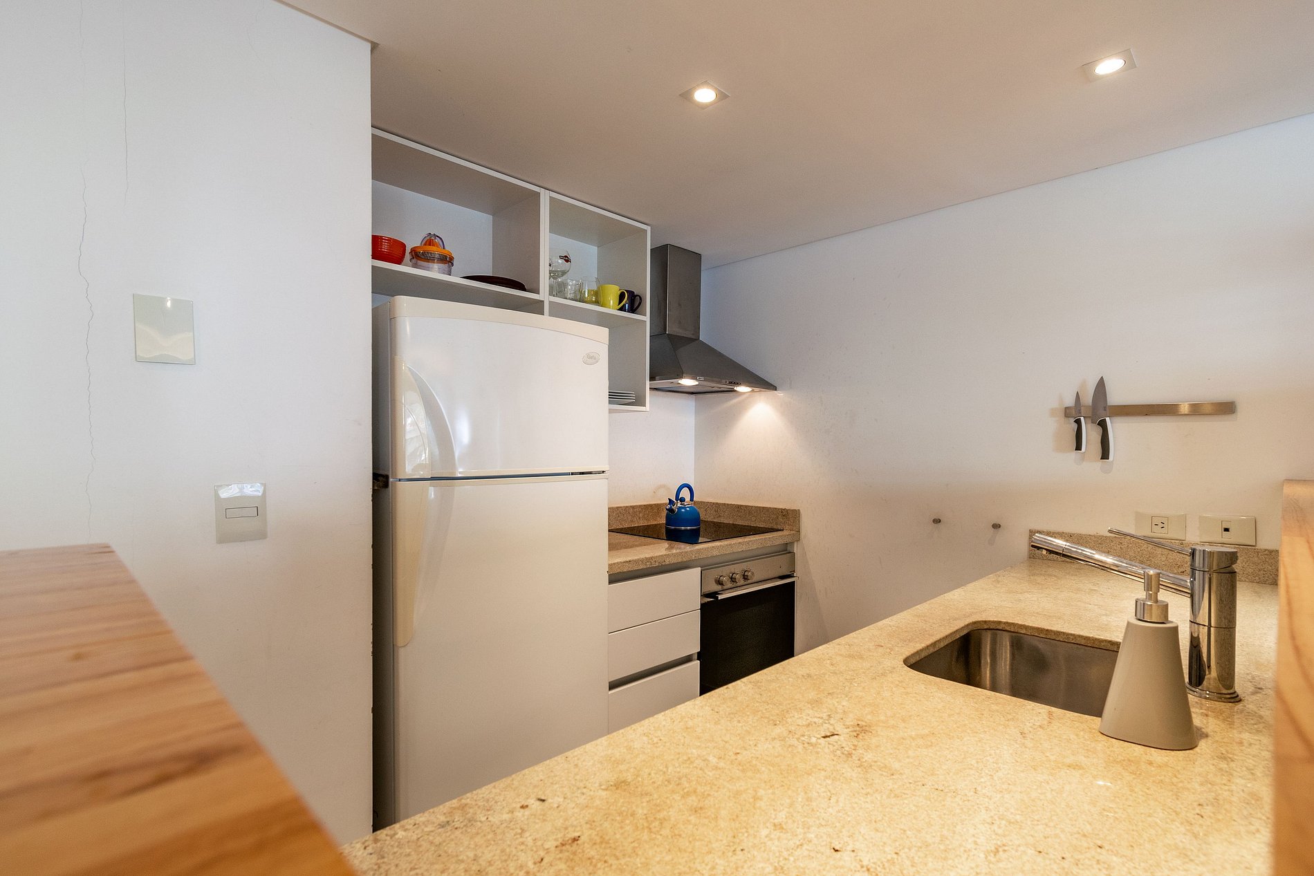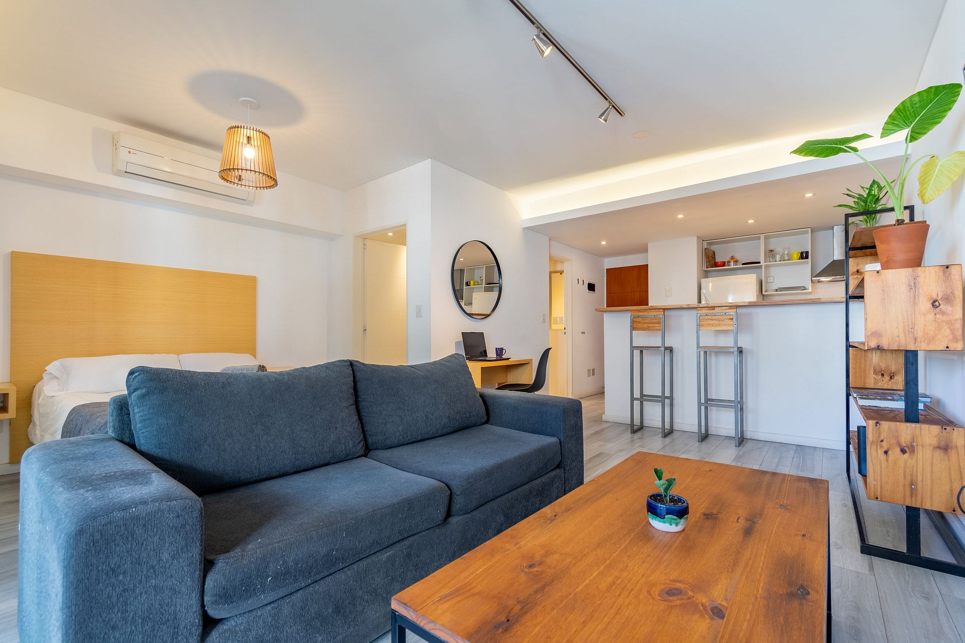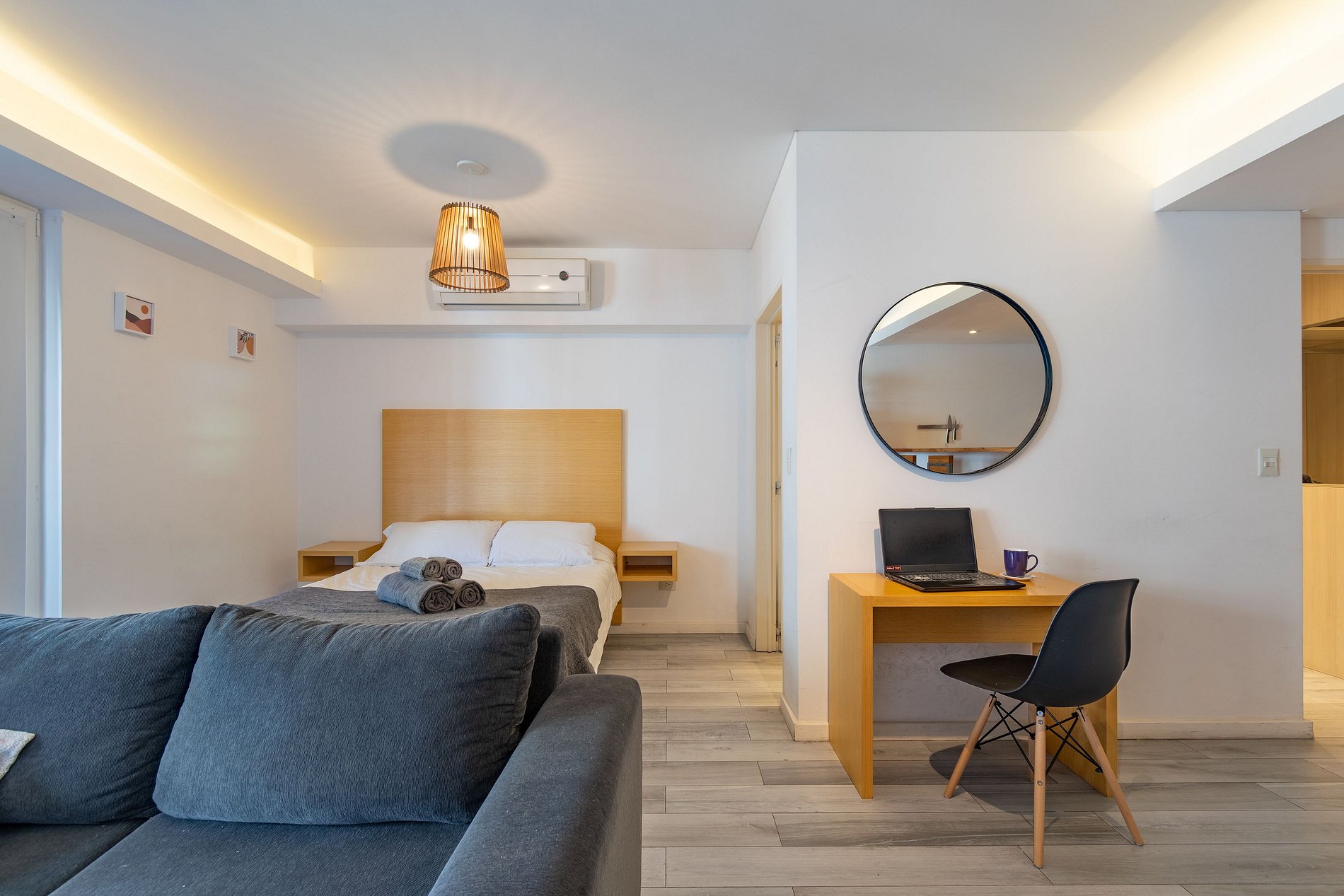 Es un monoambiente muy amplio y cómodo. Muy luminoso, pero con cortinas que bloquean perfectamente la luz. Cuenta con cama queen, smart tv, excelente conexion a internet, aire aconndicionado y calefaccion. Cocina equipada y baño completo con secador de pelo.