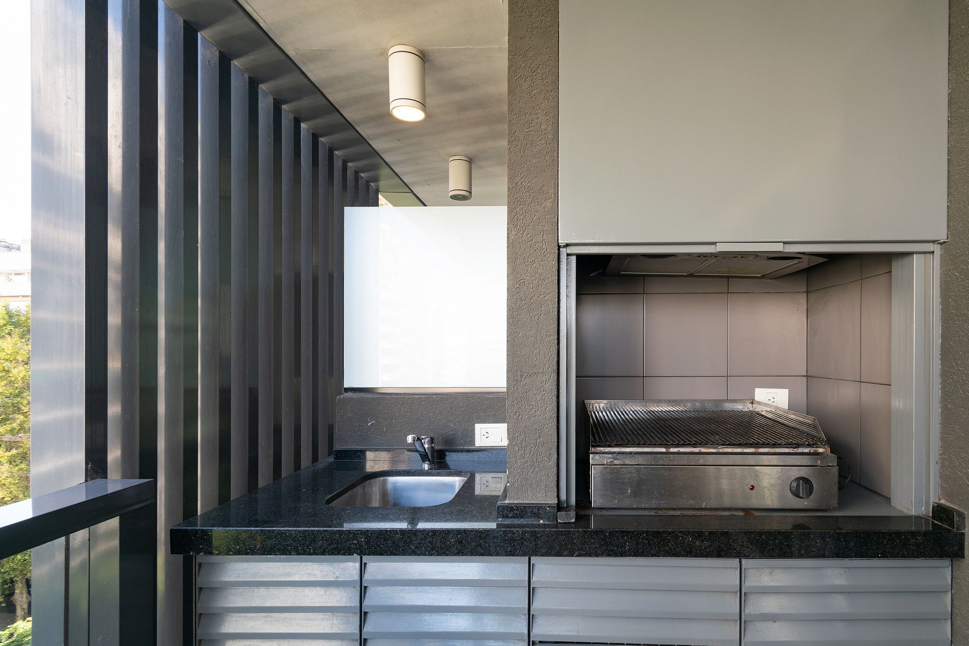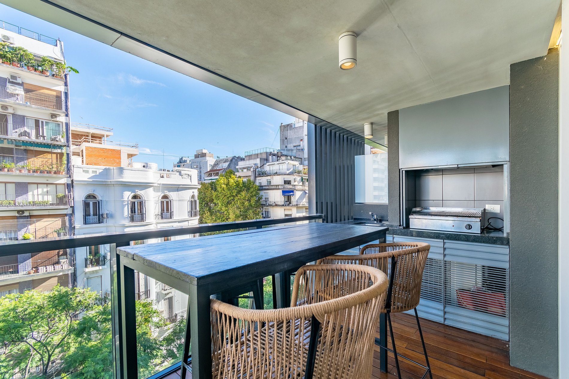 El departamento cuenta con un amplio balcón con parrilla, y una espectacular vista, hacia el techo verde de arboles sobre avenida Cerviño.