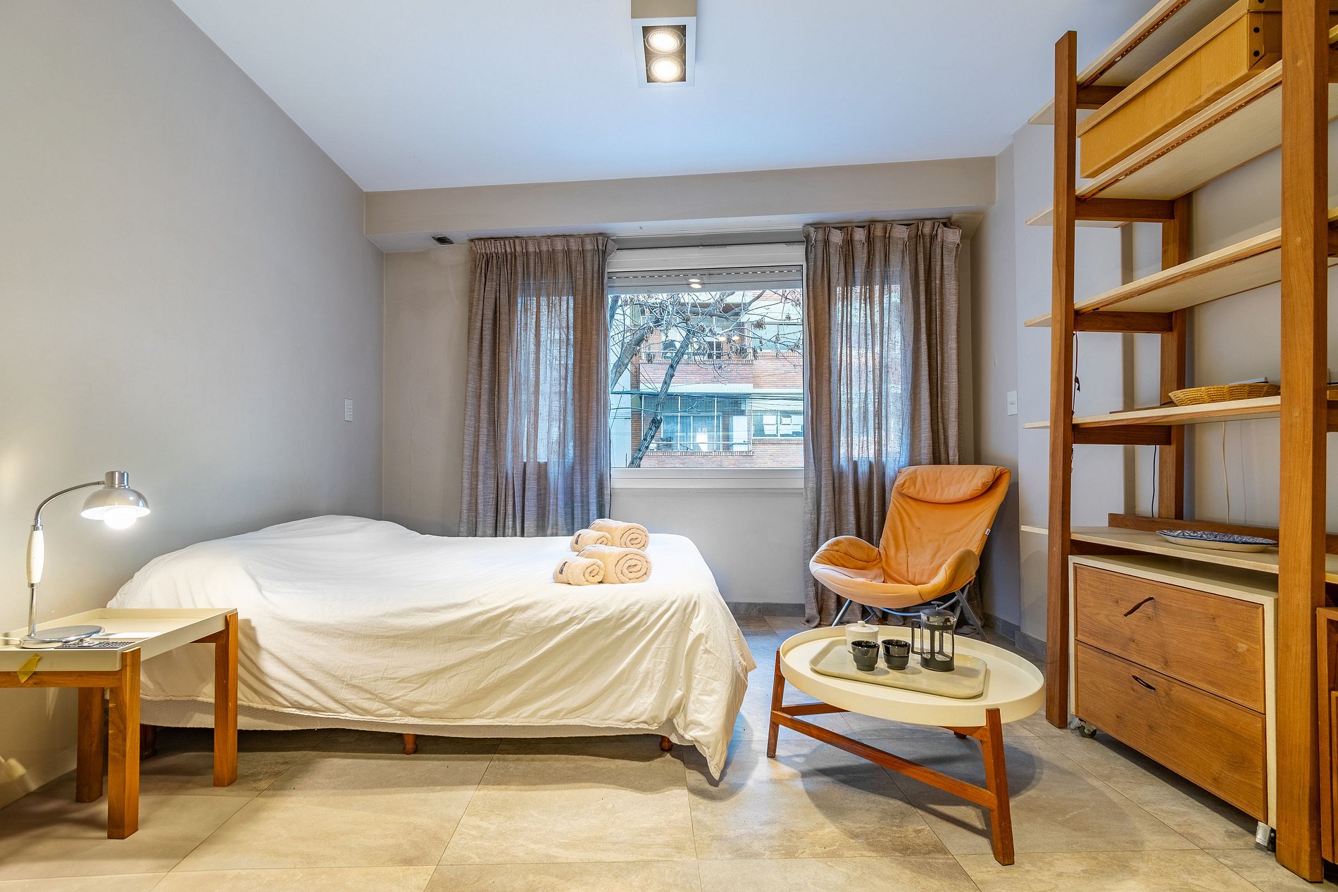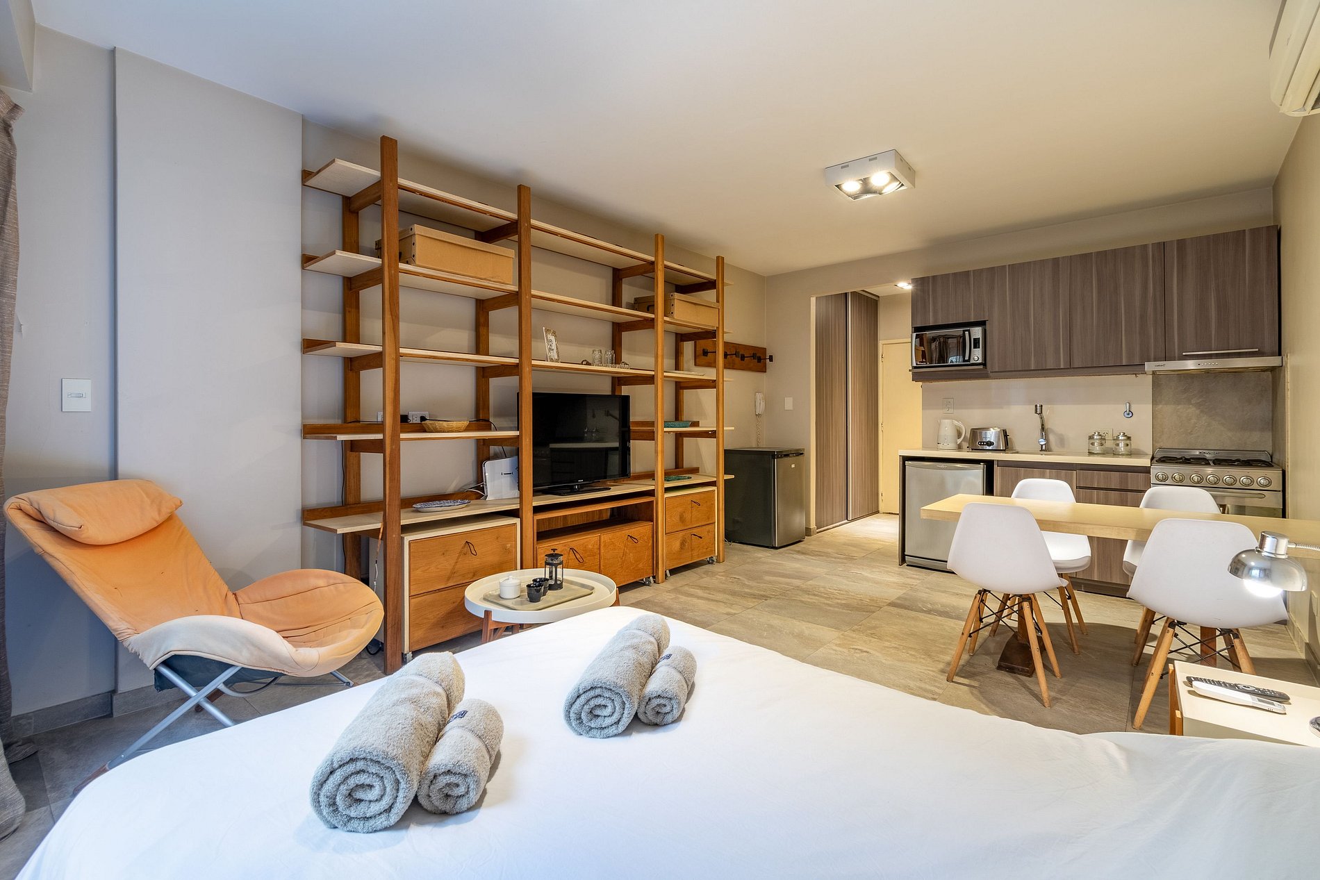Cómodo para hasta dos personas. Ventanal con vista a la calle que hace que sea un lugar luminoso durante el día. Sommier queen size muy confortable, ideal para un buen descanso. Cocina totalmente equipada con todo lo necesario para preparar una rica comida. Aire acondicionado frio calor.