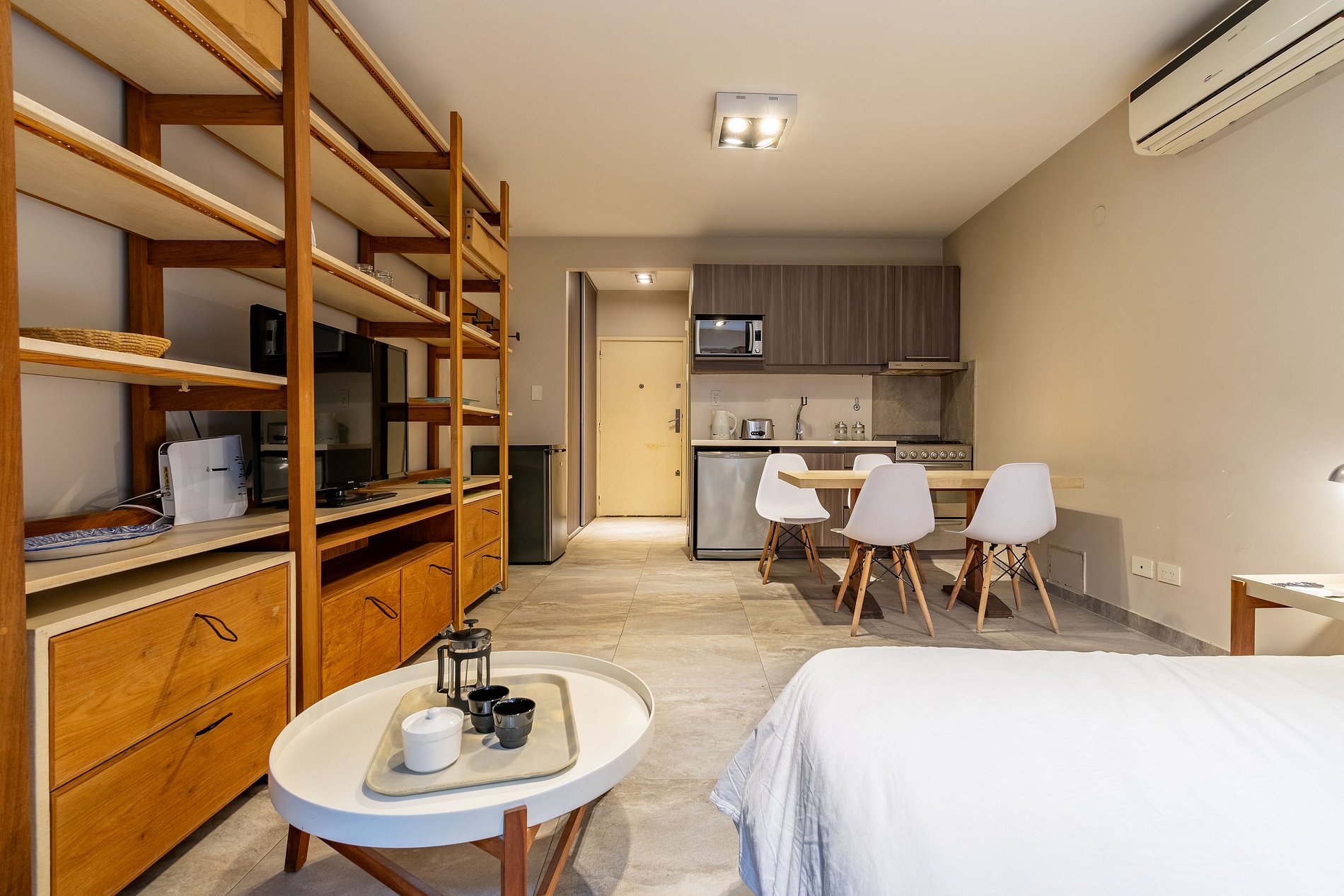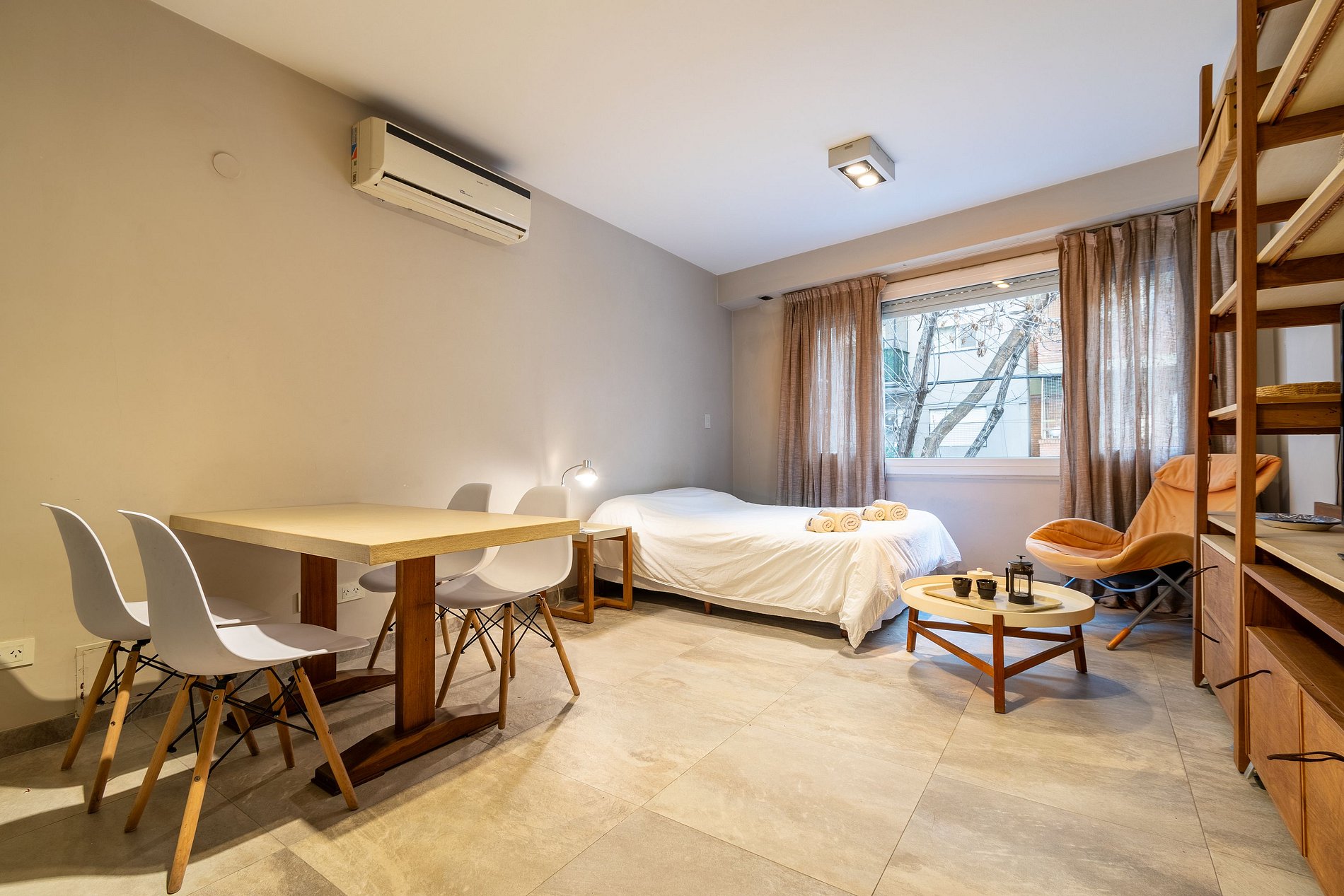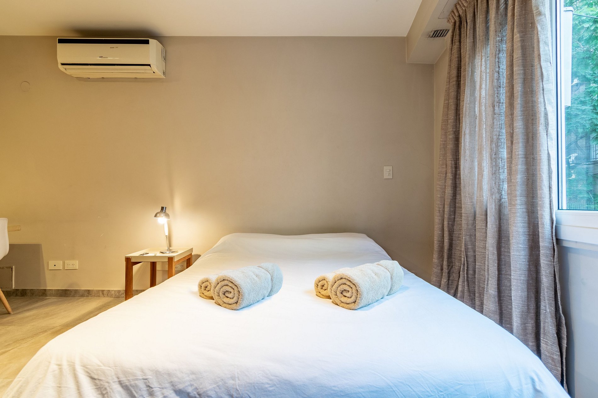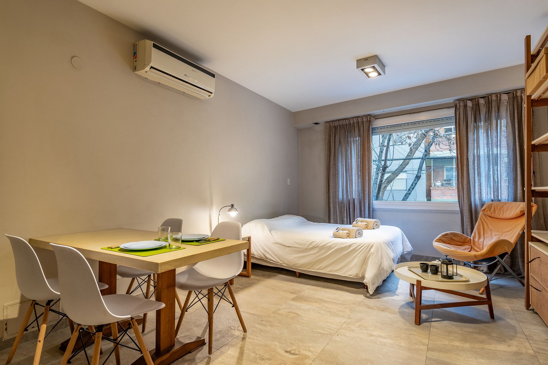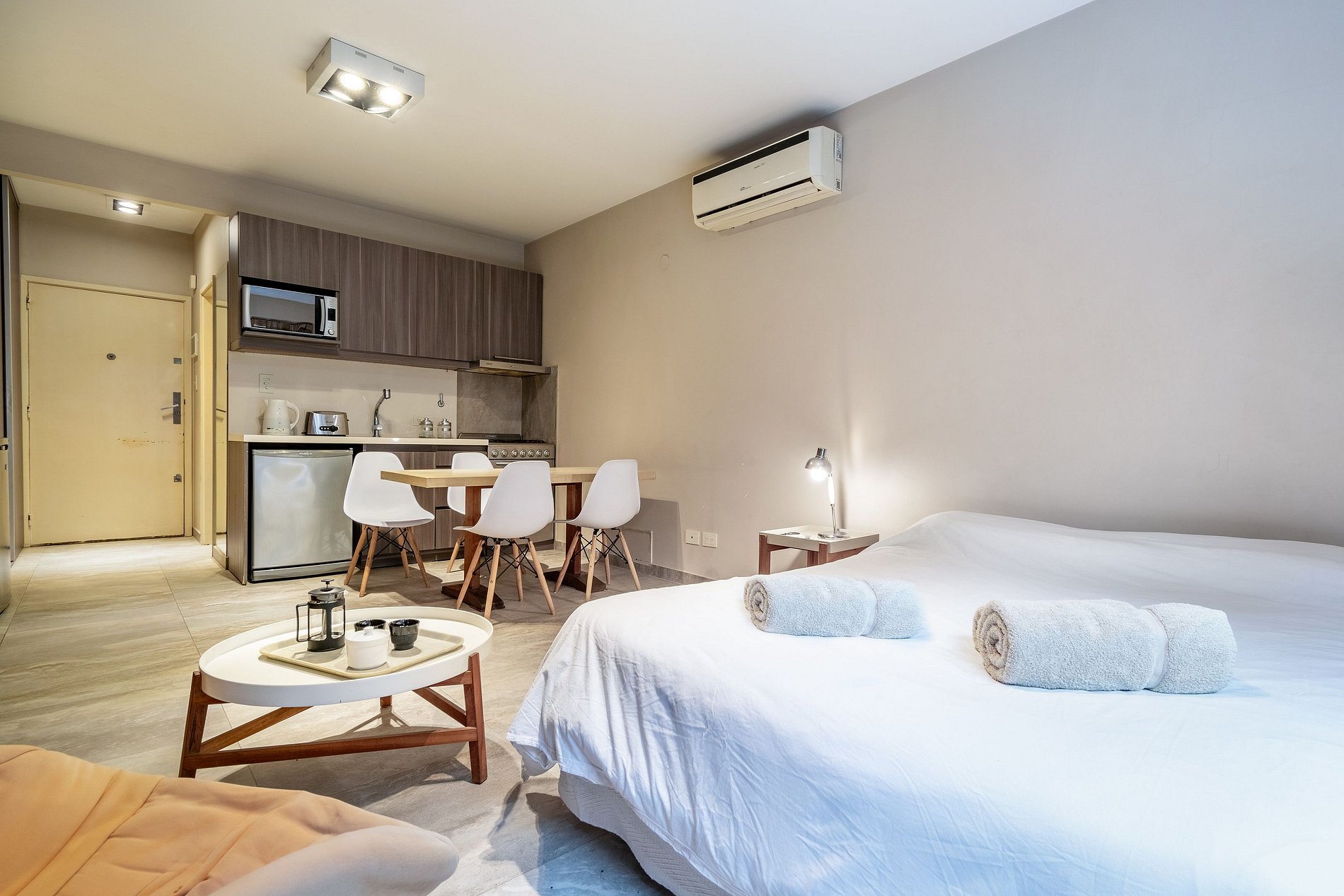 Cómodo para hasta dos personas. Ventanal con vista a la calle que hace que sea un lugar luminoso durante el día. Sommier queen size muy confortable, ideal para un buen descanso. Cocina totalmente equipada con todo lo necesario para preparar una rica comida. Aire acondicionado frio calor.