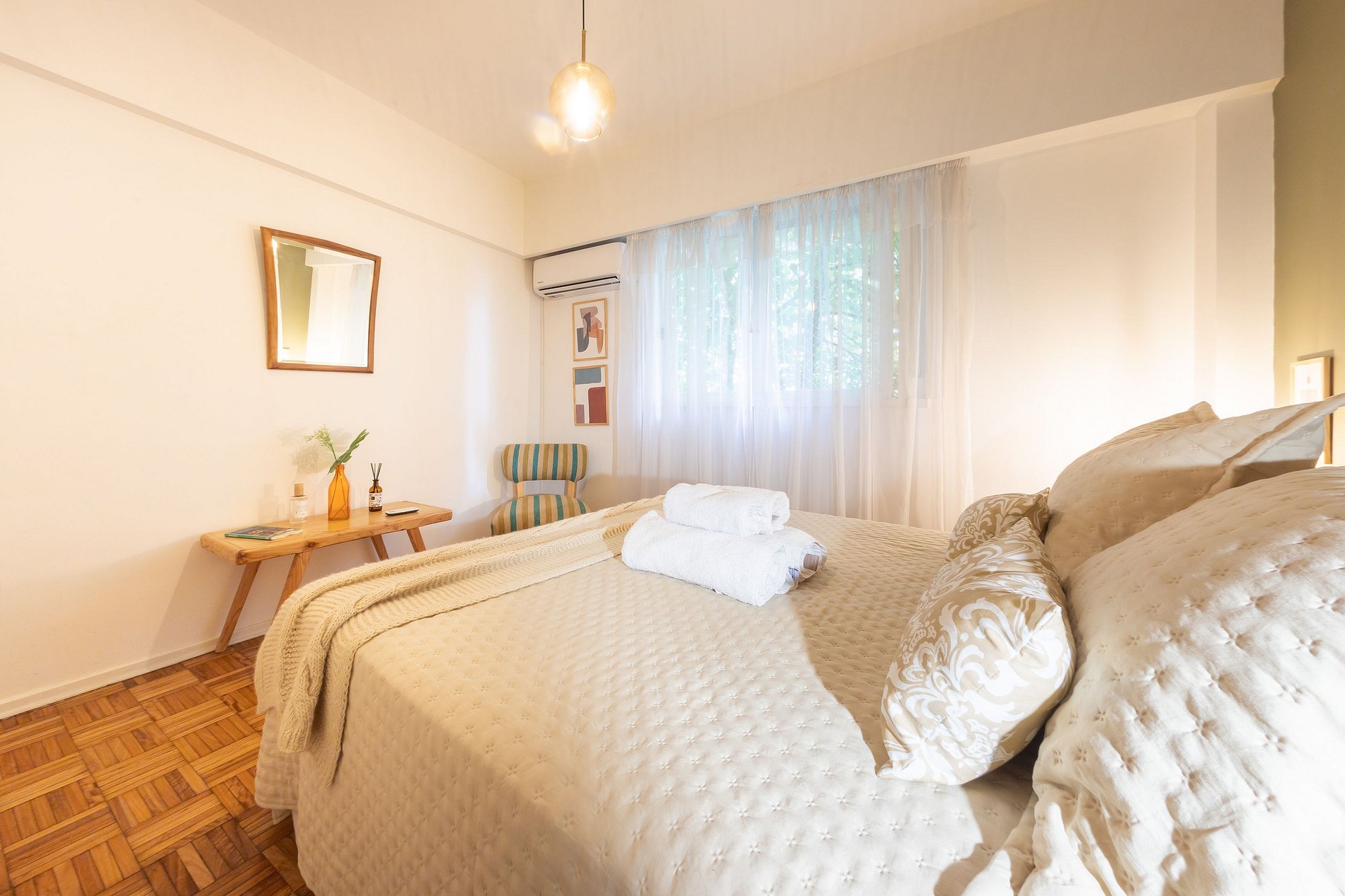 → Capacidad para cuatro personas (cama queen, individual y sofa-cama) · A/C frío-calor · WiFi de alta velocidad · Cocina equipada · Ropa de cama incluida